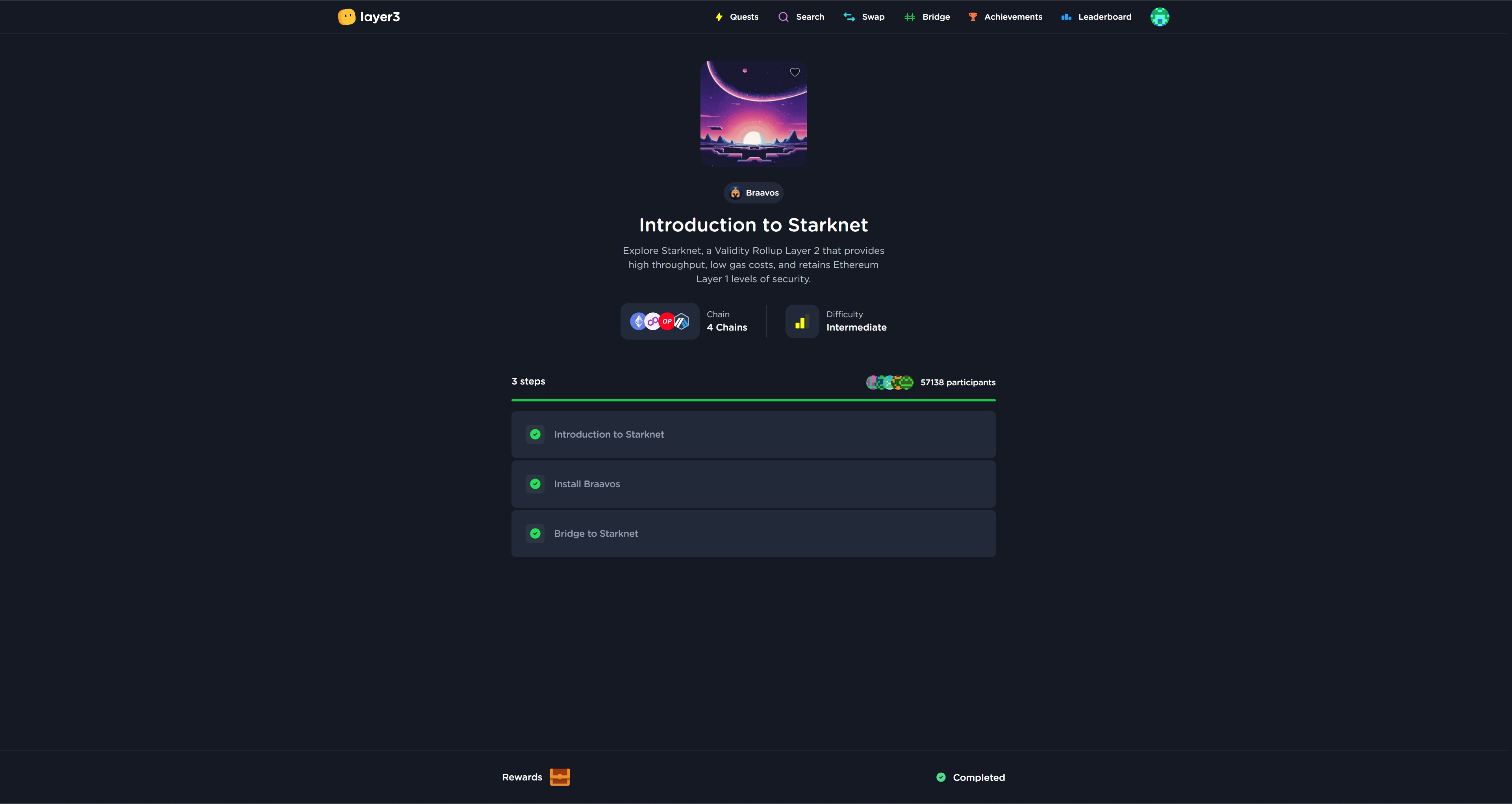 <figure><img src="https://4286049237-files.gitbook.io/~/files/v0/b/gitbook-x-prod.appspot.com/o/spaces%2F41vvUaUaaGdHwJz7DsQl%2Fuploads%2FPW4dV6yTwsxCZMsklmad%2Fstarknet%20layer3%20quest.jpg?alt=media&#x26;token=b2c84c39-55b8-4b70-8ad5-c177a8bcd7a6" alt=""><figcaption></figcaption></figure>
