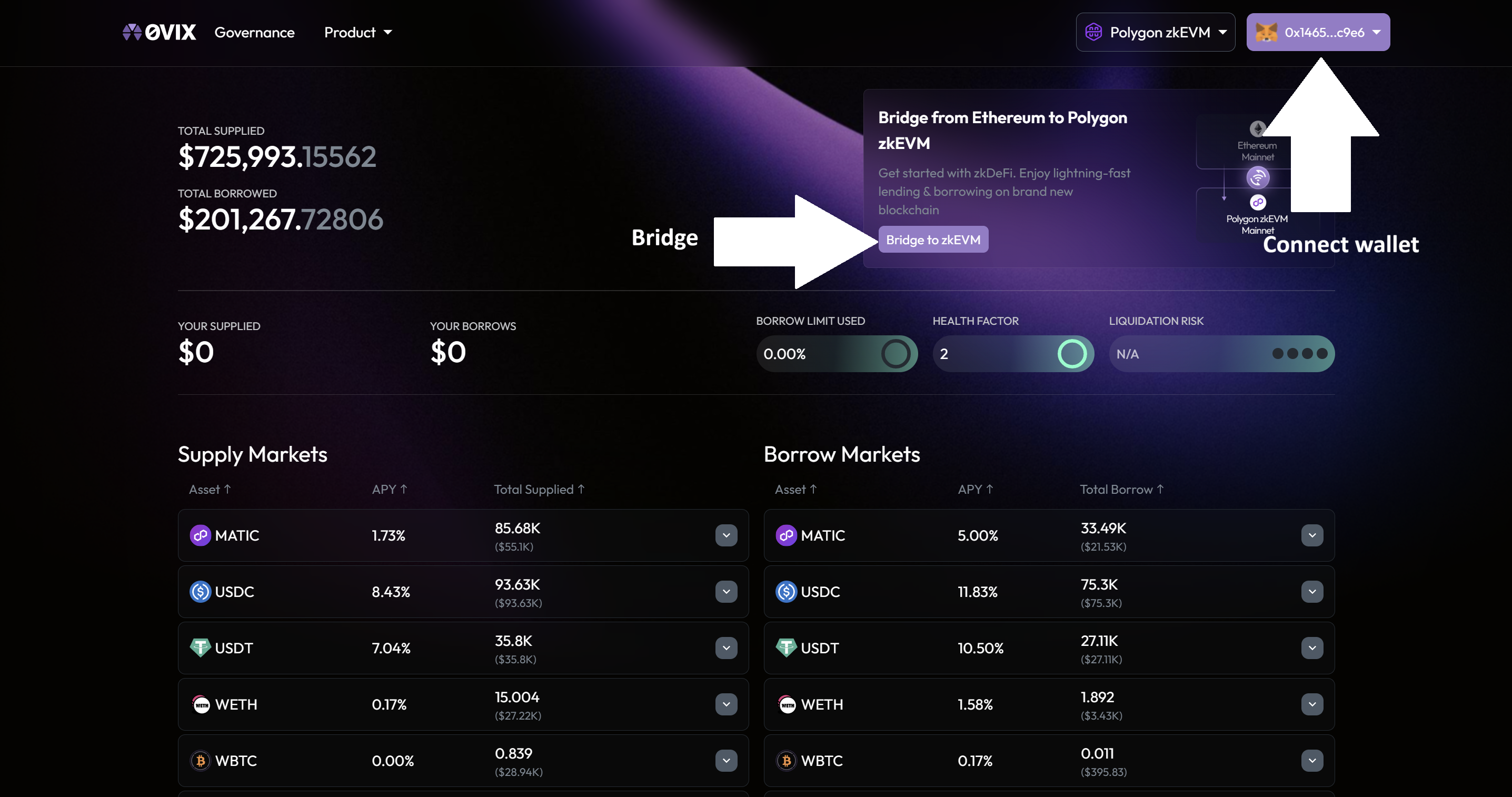 <figure><img src="https://4286049237-files.gitbook.io/~/files/v0/b/gitbook-x-prod.appspot.com/o/spaces%2F41vvUaUaaGdHwJz7DsQl%2Fuploads%2F3egW0lyD6F8DAsUy6qSO%2F0vixsupply.png?alt=media&#x26;token=8bd75cd4-7679-4e1b-8548-7749680780ae" alt=""><figcaption><p>Supply &#x26; Borrow Markets</p></figcaption></figure>