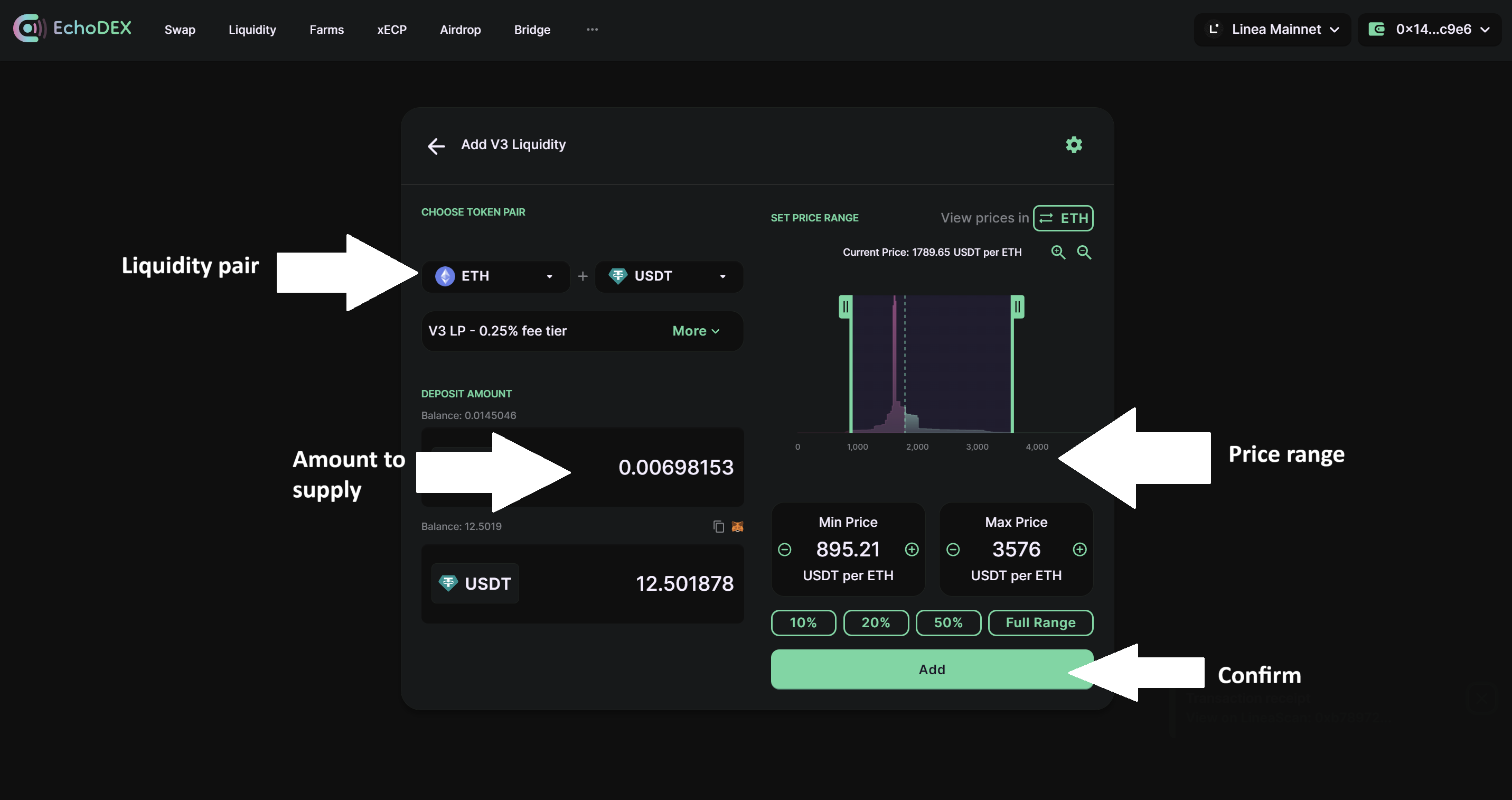 <figure><img src="https://4286049237-files.gitbook.io/~/files/v0/b/gitbook-x-prod.appspot.com/o/spaces%2F41vvUaUaaGdHwJz7DsQl%2Fuploads%2FT12YH1LKCkBPZ7gnn8ca%2Fechodexliquidity2.png?alt=media&#x26;token=7215b765-829d-4a56-994e-110440812512" alt=""><figcaption><p>Supplying liquidity pool</p></figcaption></figure>