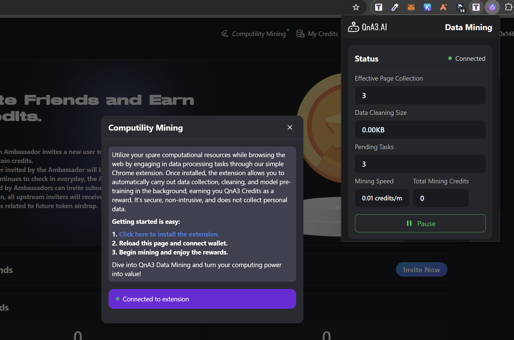 QnA3 allows to do kind of mining through browser extension. Open Computility Mining section and install web extension from provided link.&#x20;
