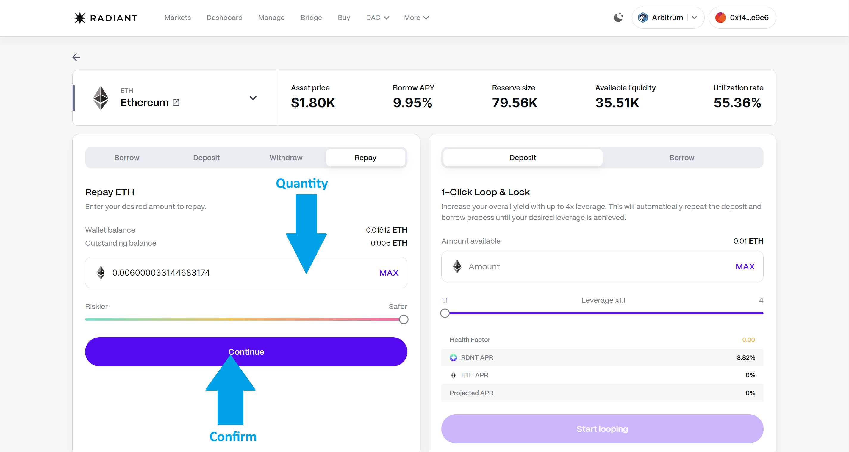 * On the next page, choose the quantity to repay (or withdraw) and click “Continue”.