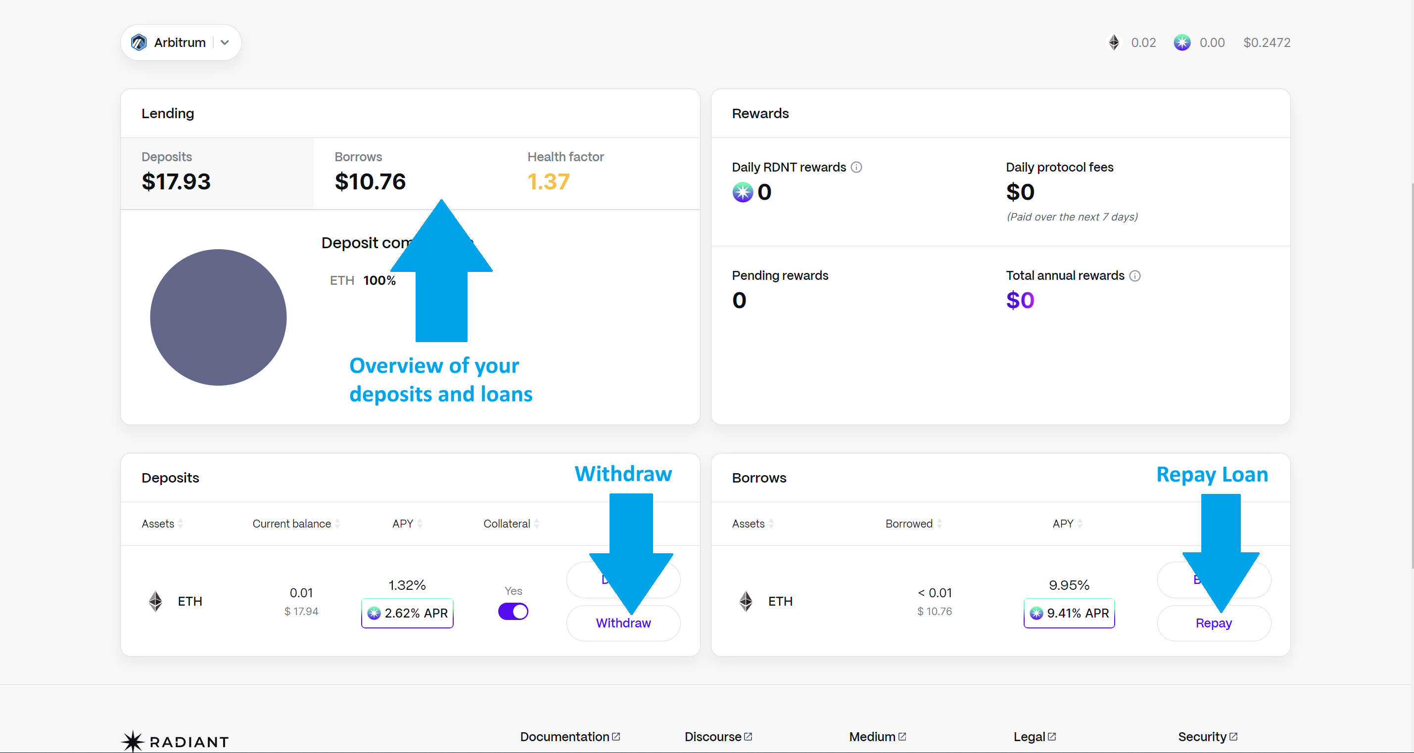 <figure><img src="https://4286049237-files.gitbook.io/~/files/v0/b/gitbook-x-prod.appspot.com/o/spaces%2F41vvUaUaaGdHwJz7DsQl%2Fuploads%2FXRR3dObIoYnKit8Sf92f%2Fradiantwithdraw.png?alt=media&#x26;token=0513ab9d-dc20-451b-8dbe-d18050d2e26f" alt=""><figcaption><p>Dashboard of deposits and loans</p></figcaption></figure>