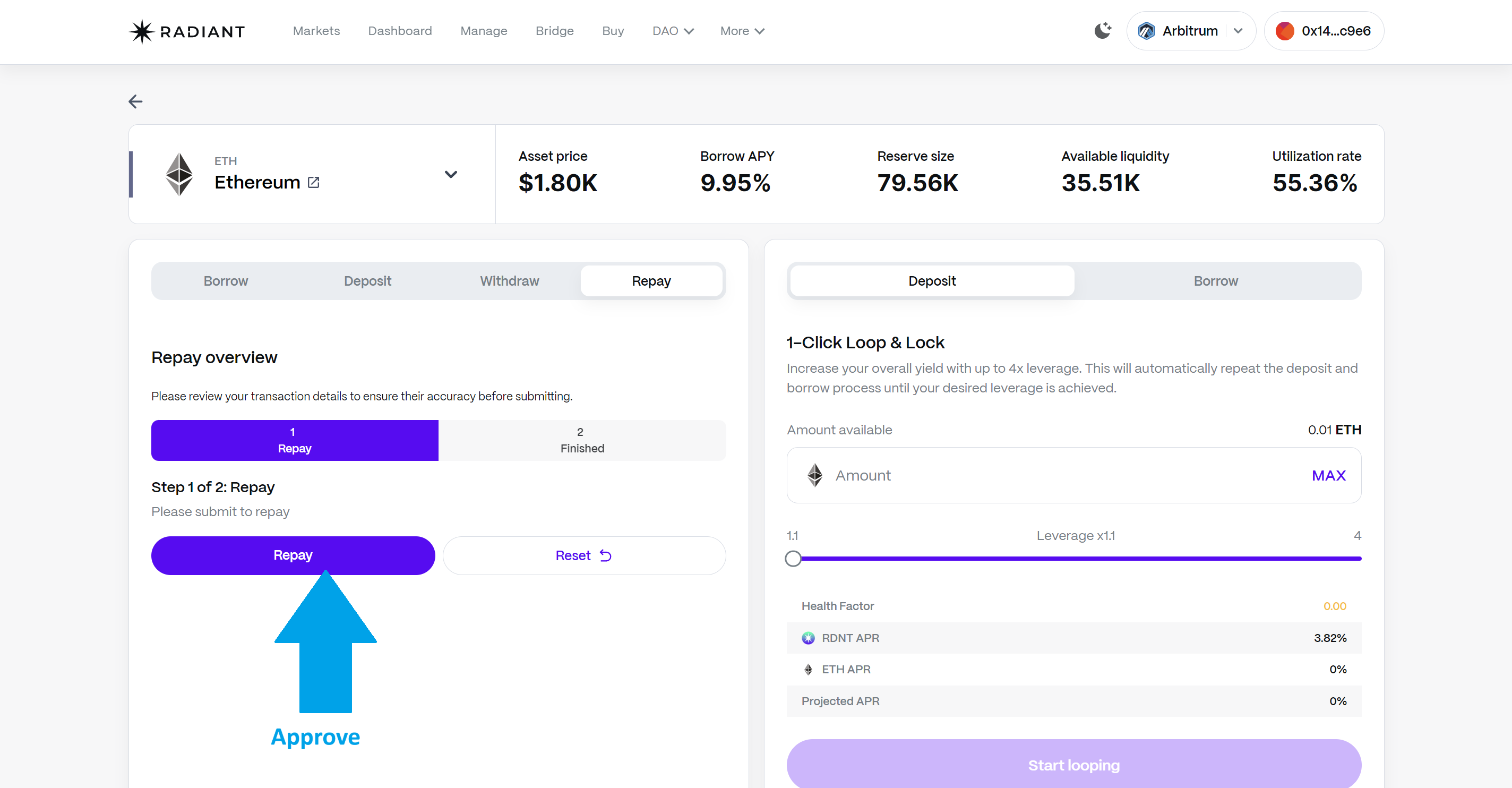 * Confirm by clicking “Repay” and then confirm the transaction in your wallet.