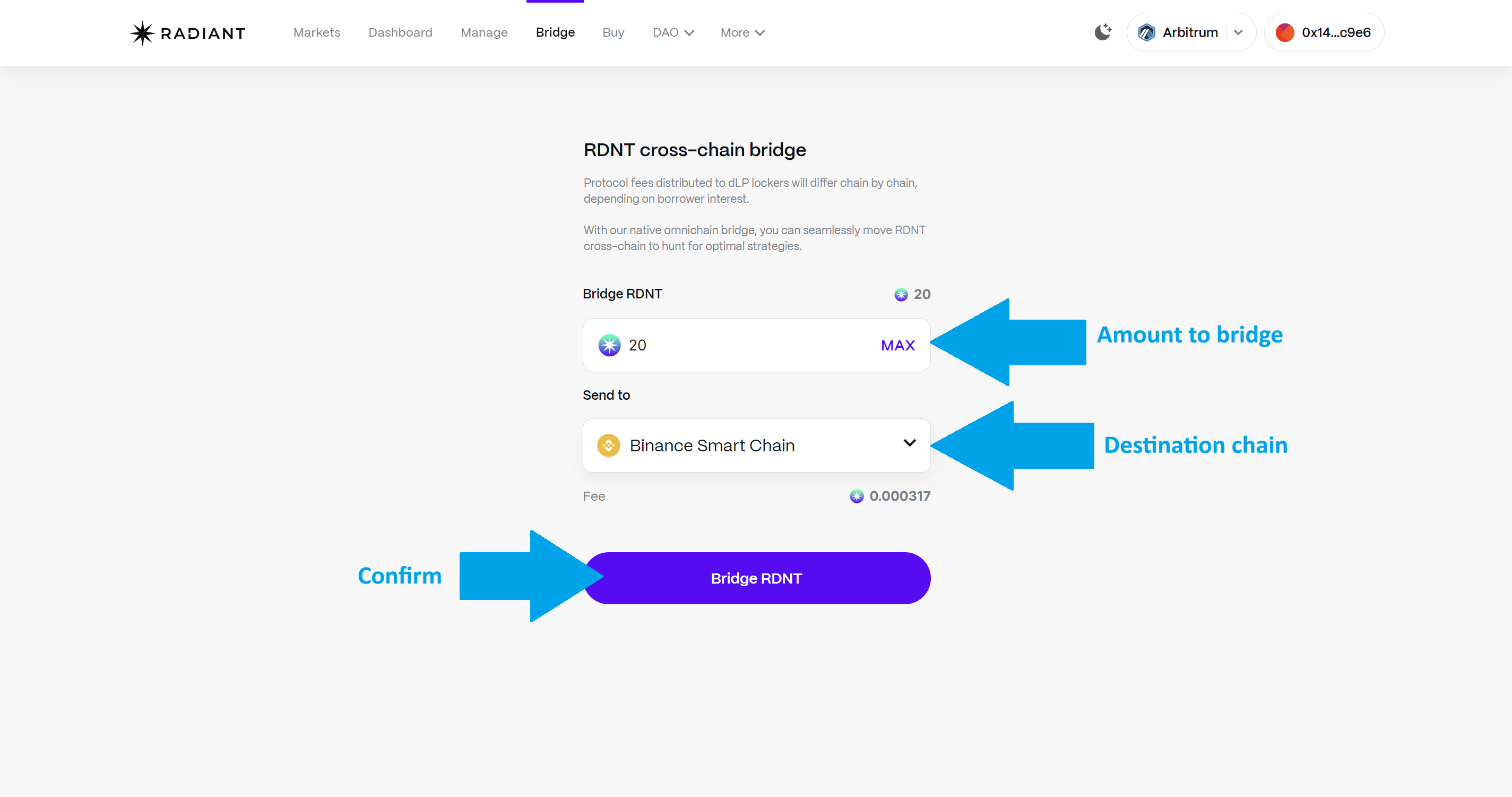 * Confirm by clicking “Bridge RDNT” on the next screen.