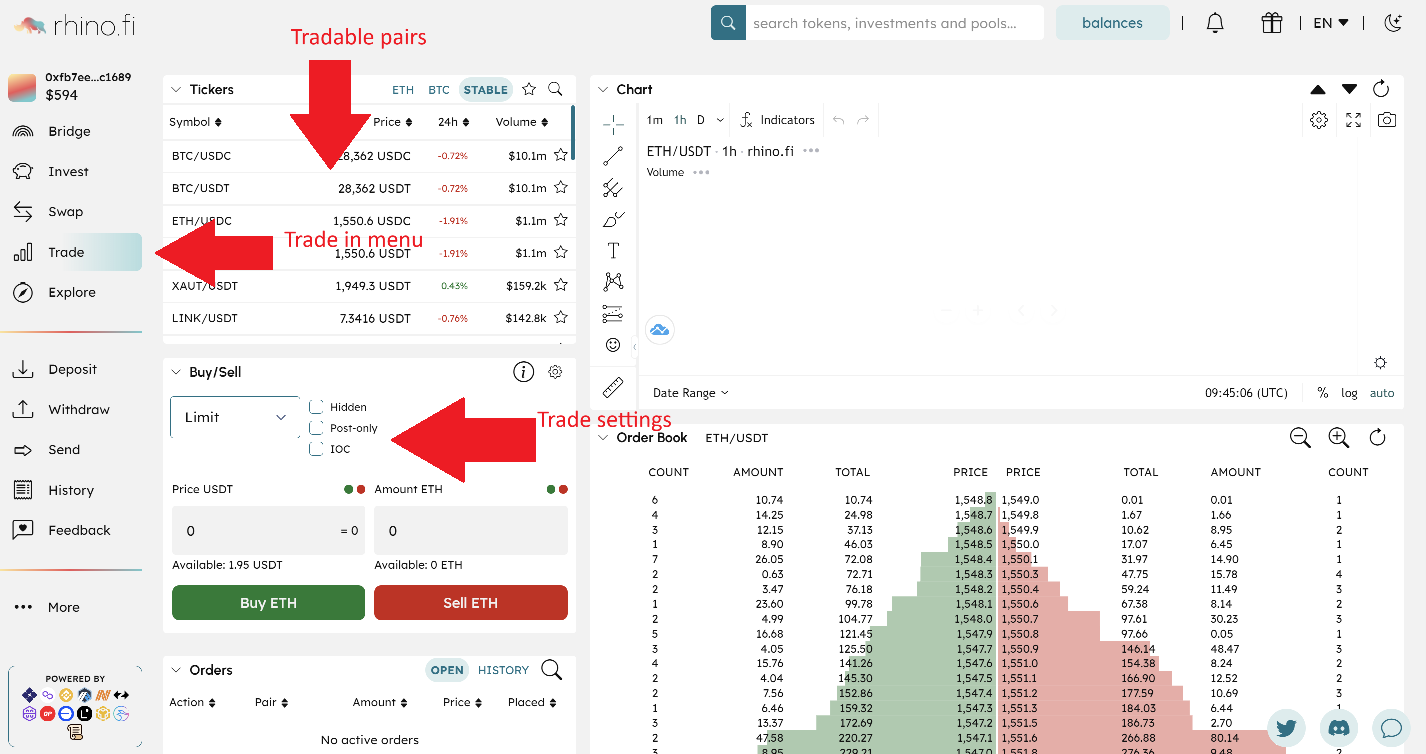* If you want to trade in a classic way, similar to what centralized exchanges offer, you can use the “Trade” option from the menu.