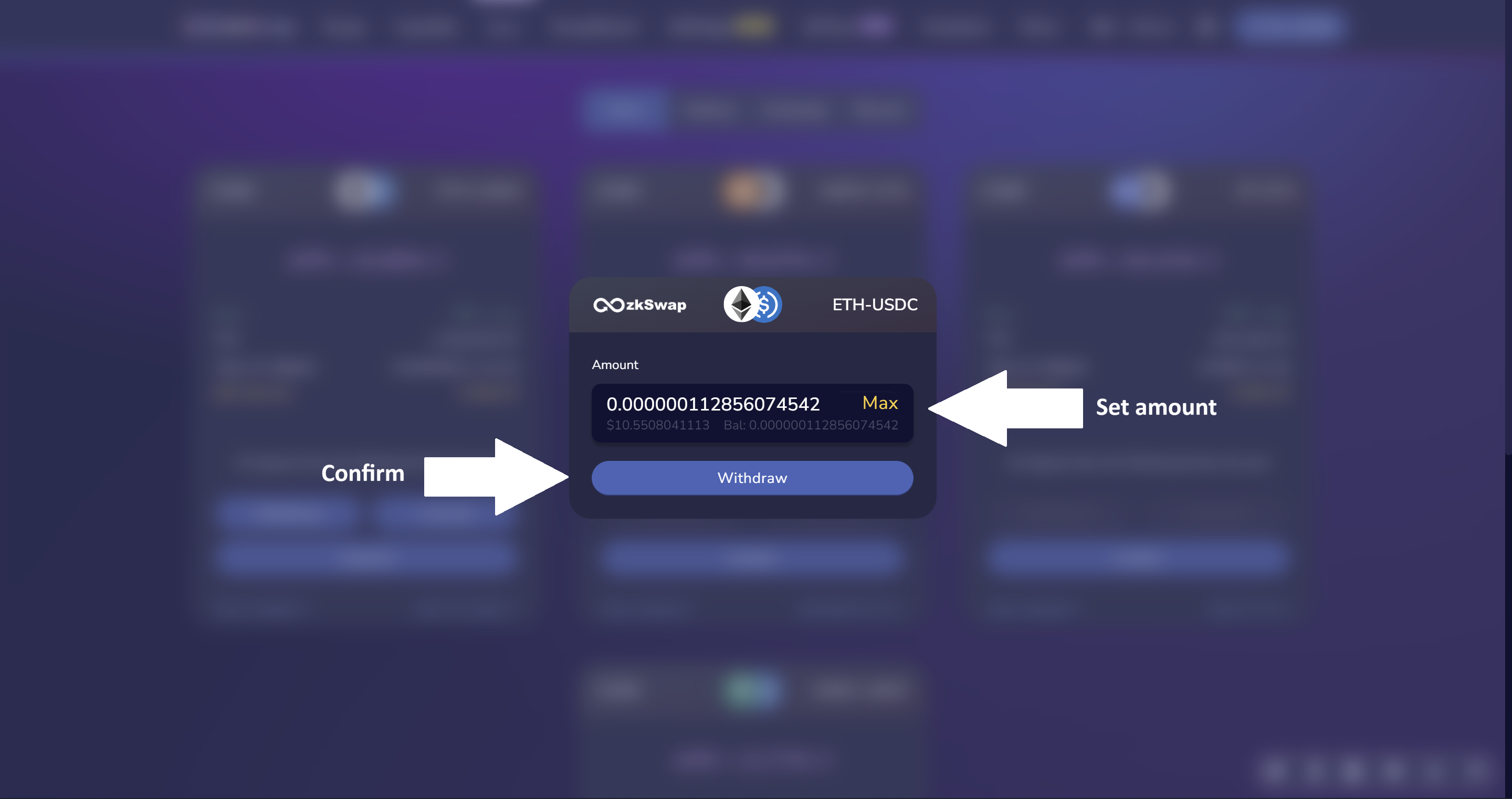 <figure><img src="https://4286049237-files.gitbook.io/~/files/v0/b/gitbook-x-prod.appspot.com/o/spaces%2F41vvUaUaaGdHwJz7DsQl%2Fuploads%2FgBnm4dttXeWz3TWAg2TD%2Fzkswapfarm3.png?alt=media&#x26;token=608c4600-8fff-4fb2-8fce-90da94a1d181" alt=""><figcaption></figcaption></figure>