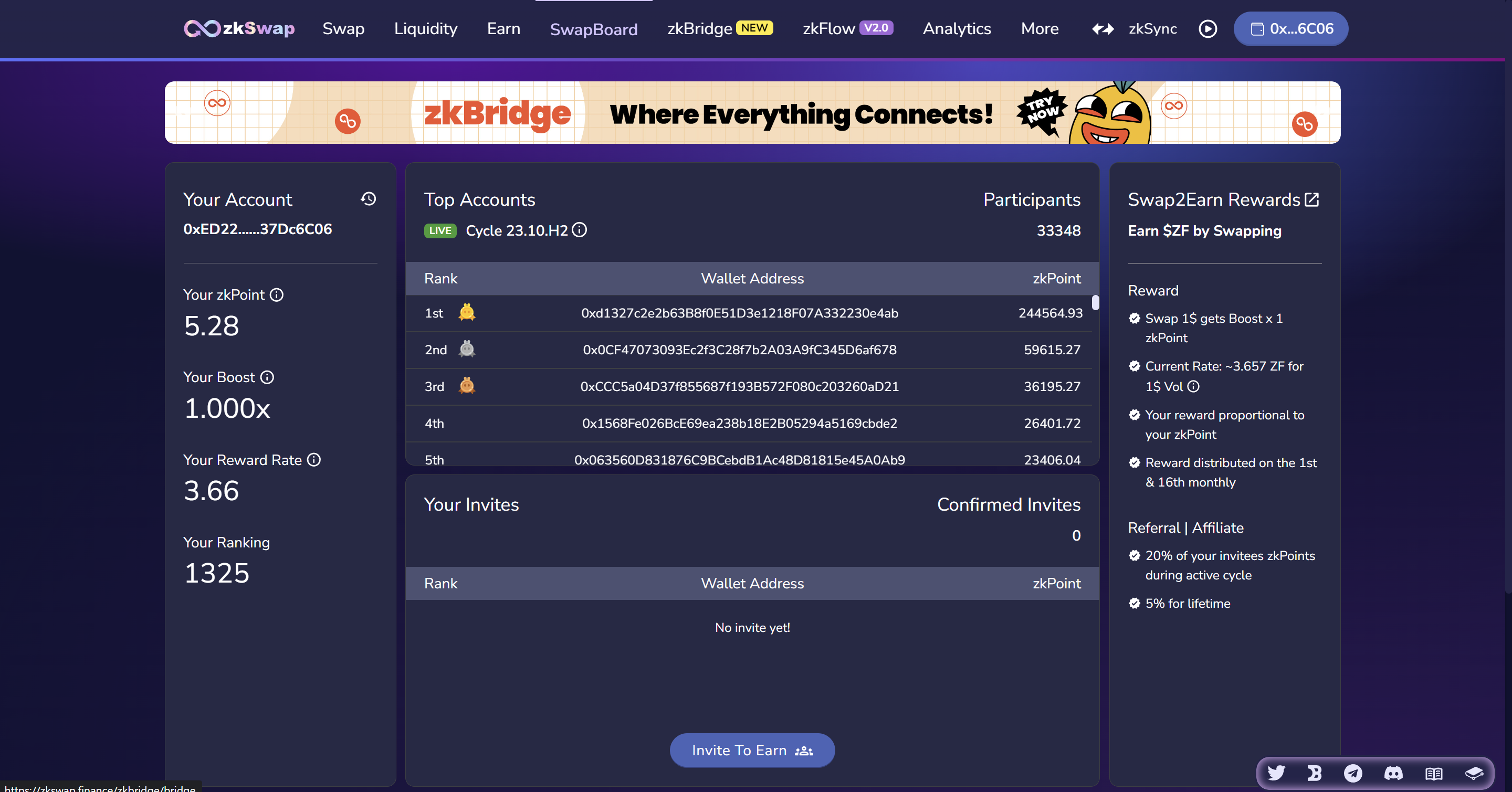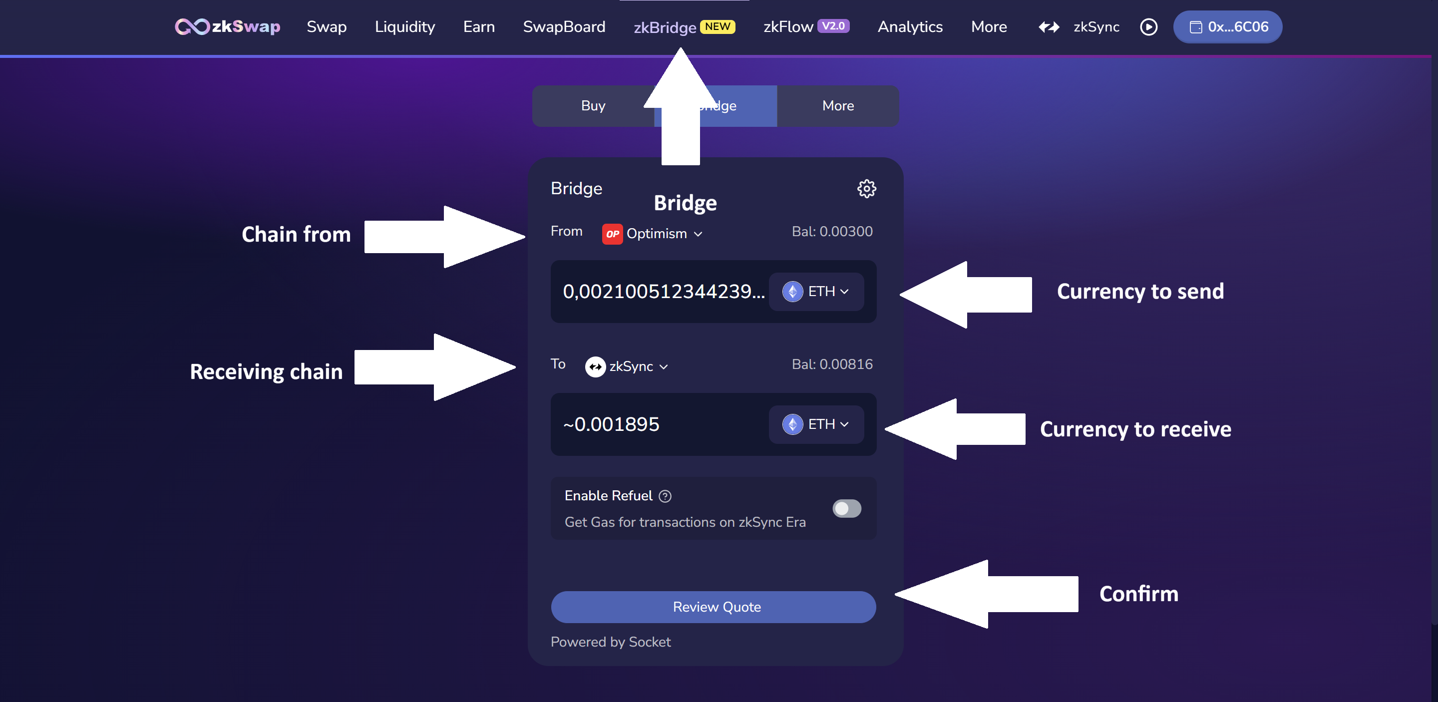 * Use zkSwap Bridge to swap tokens between chains.